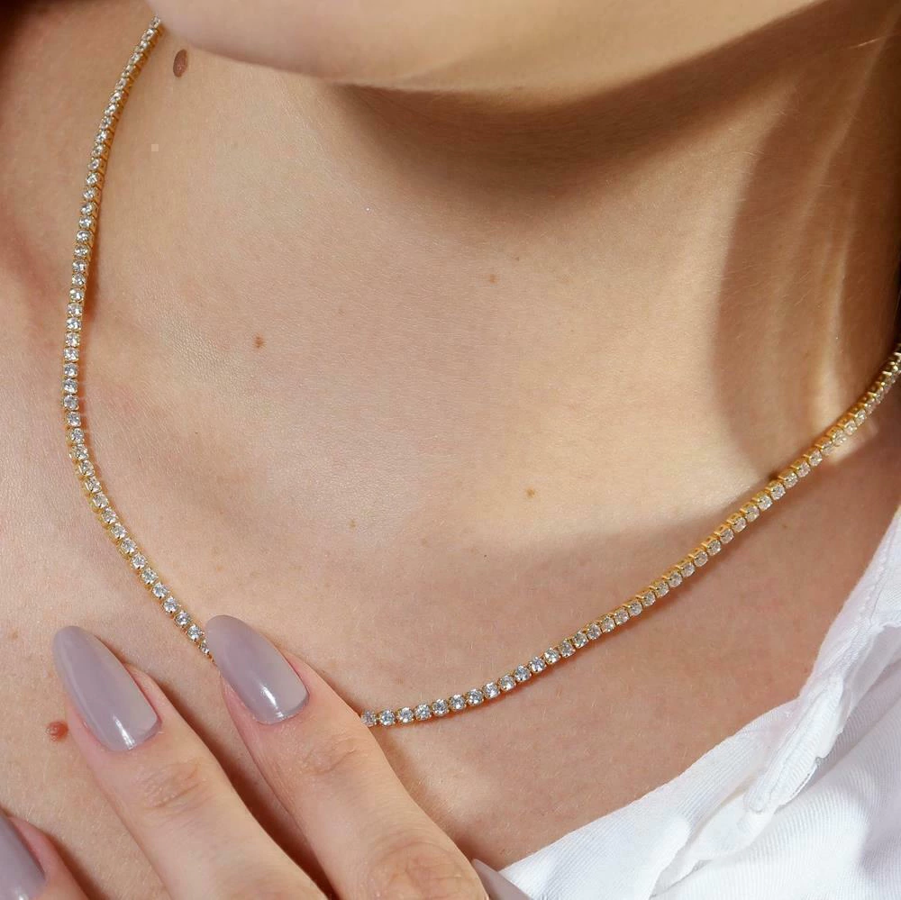 O colar Kiara é uma joia deslumbrante e sofisticada, banhada em ouro no estilo Riviera, que é conhecido por apresentar diversas pedras preciosas ou zircônias cravadas ao longo da corrente. As zircônias na cor cristal brilham intensamente, adicionando um toque de elegância e glamour à peça. A corrente do colar Kiara é fina e delicada, proporcionando um visual suave e sofisticado. O comprimento é perfeito para destacar as zircônias cristalinas ao longo da corrente, que se apresentam em uma sequência brilhante e charmosa.