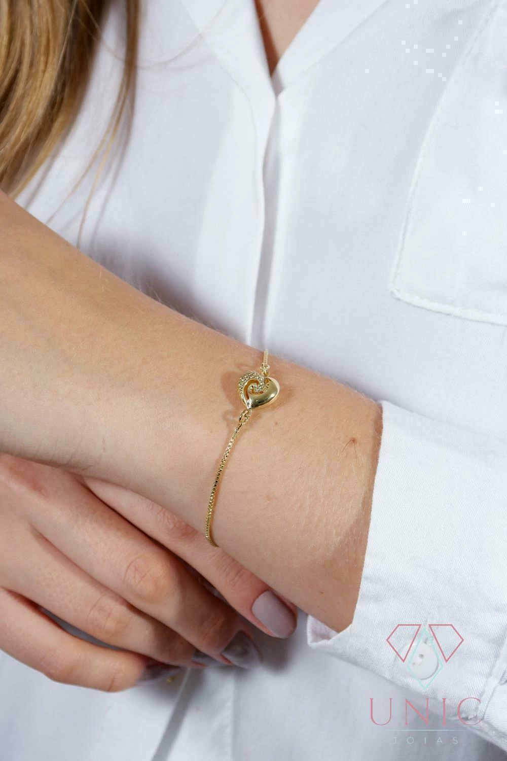 A pulseira June tem um banho de ouro e um design delicado com uma correntinha fina e um coração centralizado. O coração é detalhado com um lindo design que adiciona um toque de elegância e sofisticação à peça. A pulseira é uma excelente opção para quem busca uma joia romântica e delicada para complementar looks casuais e formais.